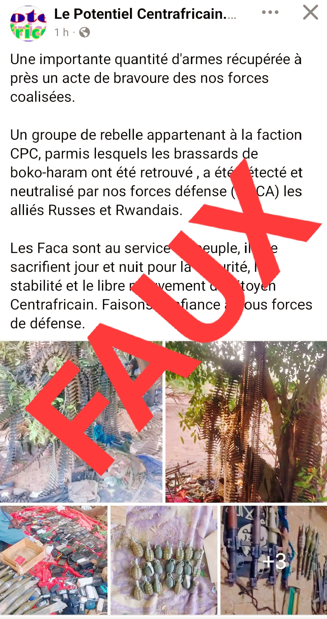 Une page Facebook dénommée Le Potentiel Centrafricain.com a fait une publication le dimanche 20 Avril 2025 faisant croire que: « Une importante quantité d’armes récupérée à près un acte de bravoure de nos forces coalisées ».
