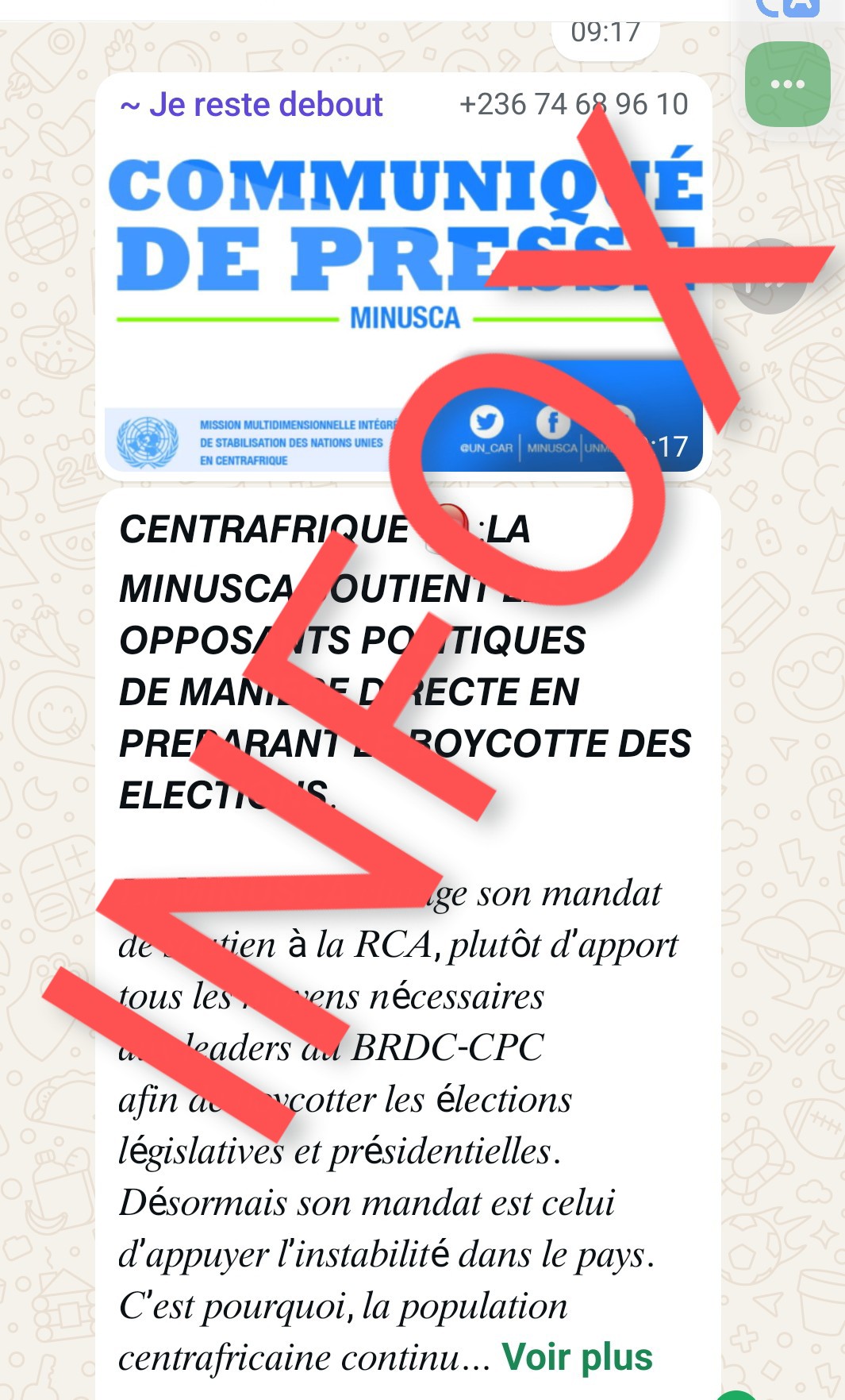 L’infox soutient : “La MINUSCA change son mandat de soutien à la RCA, plutôt d’apport tous les moyens nécessaires aux leaders du BRDC-CPC afin de boycotter les élections législatives et présidentielles. Désormais son mandat est celui d’appuyer l’instabilité dans le pays. C’est pourquoi, la population centrafricaine continue de s’opposer à la MINUSCA dans tout le pays”.