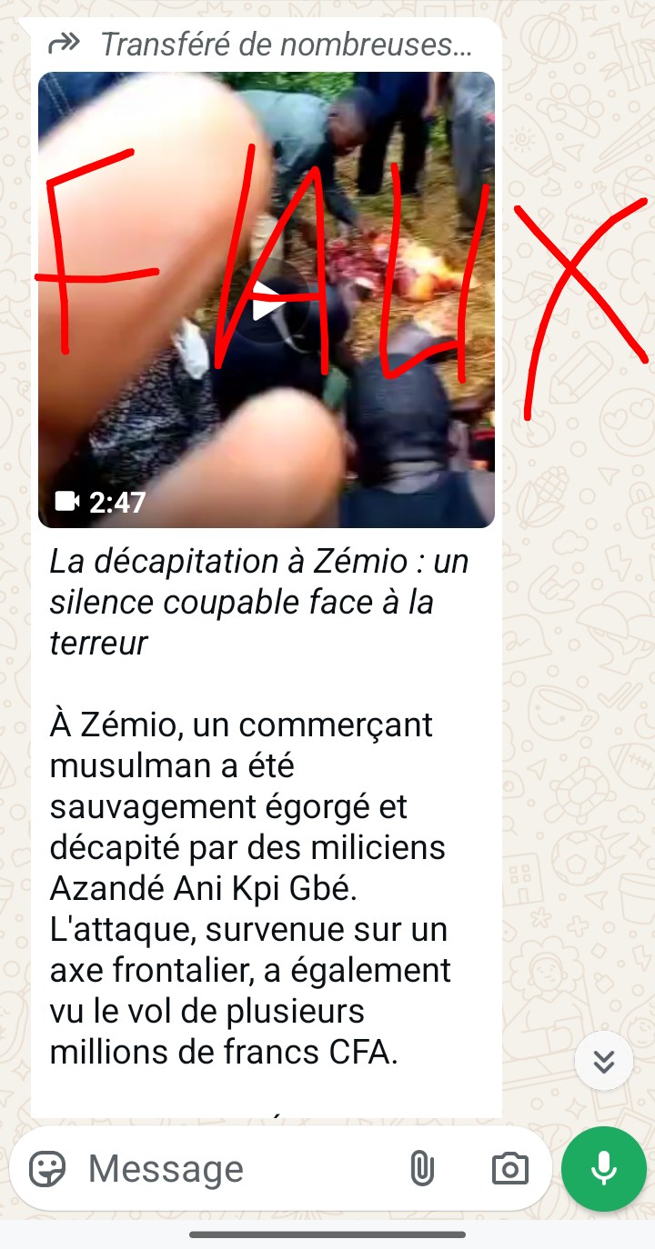 Depuis quelques temps en République centrafricaine, un article du titre : << la décapitation à Zemio un silence coupable face à la terreur >> accompagné d’une vidéo dans laquelle on voit un groupe des gens en pleine décapitation d’un homme, a alimenté les réseaux sociaux laissant croire que ce sont le groupe des miliciens de groupe Azandé Ani Kpi Gbé qui ont connu cet acte odieux.Saisi par son atrocité et sa circulation à vitesse fulgurante sur les réseaux sociaux, la rédaction des vérificateurs communautaires a lancé une procédure de vérification permettant de faire la lumière sur cette vidéo qui tende à semer le trouble dans le pays. Mais après cette procédure vérification, la rédaction des vérificateurs communautaires du Réseau des Médias Communautaires de Centrafrique(RMCC) ont jugé que la vidé vidéo publiée est hors contexte.Cependant, il s’agit d’une vidéo contextualisée publiée depuis Nigeria d’un groupe de cannibales qui étaient en train de morceler un homme dont on ignore la raison.Pour se rassurer de la véracité des faits, nous avons contacté le Préfet de la préfecture de haut Mbomou, qui a infirmé les faits et appelle la population à plus de vigilance afin de préserver la paix et la cohésion sociale dans sa localité.Notons que la ville de Zemio dans la préfecture de haut Mbomou a été le théâtre d’une attaque attribuée aux miliciens du groupe Azandé Ani Kpi Gbé le dans la soirée du 1er janvier provoquant des pertes en vie humaine, d’énorme débats matériels et du déplacement massif de la population. Face à cette situation, la population centrafricaine doit faire preuve de prudence devant chaque publication, vérifier les faits avant de les partager. Ensemble luttons contre la désinformation et l’intoxication des informations en République centrafricaine.