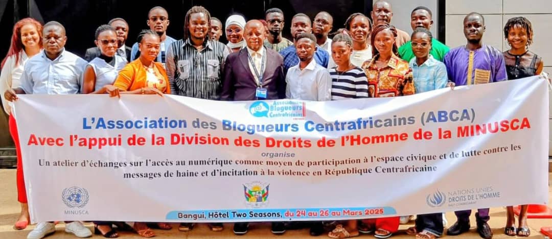 Ce mardi 24 mars 2026, l’Association des blogueurs centrafricains a organisé un atelier dans l’hémicycle de l’Hôtel Deux Saisons à Bangui. Financé par la division des Droits de l’Homme de la MINUSCA, cet atelier avait pour objectif de montrer comment l’espace numérique, souvent vecteur de désinformation, peut devenir un outil efficace pour lutter contre les discours de haine et prévenir les violences en Centrafrique.